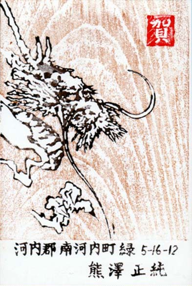 版画は昔の龍の2度目のお色直しです。背景を木目が浮き出た板で彫りなおし、下部に住所を刷れるよう龍の角の部分を少しカットしました。ただこの龍の賀状を3度出した方は段々少なくなってきました。高校の親友と防大の恩師と同期の一部の方でしょうか?