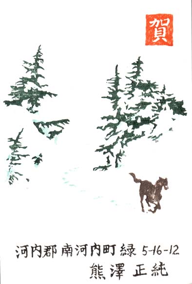 版画は筆まめ付属のサンプル画像を原画にしました。ただし正真正銘、手彫りの手刷りですので念のため。また色が薄くてよく見えませんが、木に積もった雪や馬の足跡を水色で入れております。