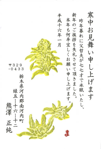 寒中お見舞い申し上げます。 昨年暮れの父の葬儀に際しましては、多くの皆様から丁重な弔電や香典を頂き有難うございました。この場をお借りして御礼申し上げます。 例の版画は、成人の日の連休に手抜きながら制作しました。 今年もよろしくお願い申し上げます。