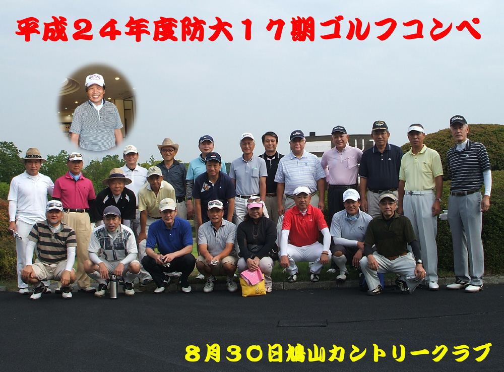 8月30日(木)猛暑の中、恒例の防大17期ゴルフコンペが鳩山カントリークラブで挙行されました。 幹事は海の村木君で、参加者は陸7名、海11名、空6名の総勢24名でした。 個人優勝は、盛山君でグロス83、ベスグロは佐藤清君の76でした。 空は優勝者とベスグロを出しながら、上位5名のグロスの合計で決まる団体優勝は海という結果となりました。 次回の幹事は空で、同じ場所で実施予定とのことです。皆さん奮ってご参加ください。