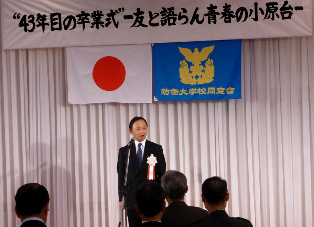 「・・防衛大学校の教職員を代表して、本日小原台を巣立つすべての卒業生諸君に対して、心から祝意を表したいと思います。 ・・・・・・・・ 本日の卒業式には、昭和四十八年に防大を卒業された第十七期の皆さんが、四十三年ぶりにホームカミングデーで参列されています。本日、ここに集われた防大卒業生の皆さんは、危機と隣り合わせのぎりぎりの場で、国の平和を守るという職務を全うされ、今日までの日本の安寧を支えてきました。 今日の日本の平和と繁栄は、第十七期の皆さんをはじめとした自衛隊が、日常生活から見えないところで、地道にかつ誠実に任務を遂行された賜物であります。ミッションを無事にコンプリートされて、今日この小原台に凱旋された第十七期の皆さんに盛大な拍手をお願い致します。 ・・・・・・・・」