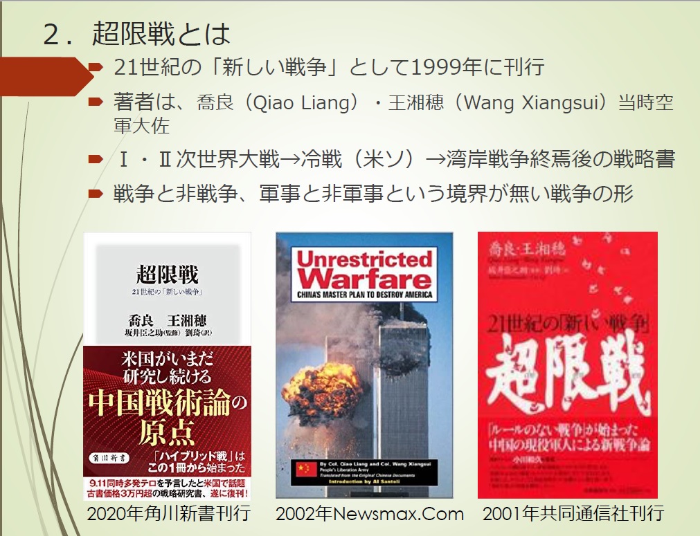 コロナ感染緊急事態宣言が発令される3日前にグランドヒル市ヶ谷で講演してきました。演題は「中国の超限戦と日本の課題」です。新ディフェンスリサーチセンター理事の廣瀬清一さんが企画した自主研究会でのことですが、皆さん大変興味を持って聞いていただきました。 着々と新しい戦争の形を実践してきている中国に如何に対処するか、政治家にしっかり考えていただきたいですね。画像はプレゼンの一部です。ご笑覧下さい。 |